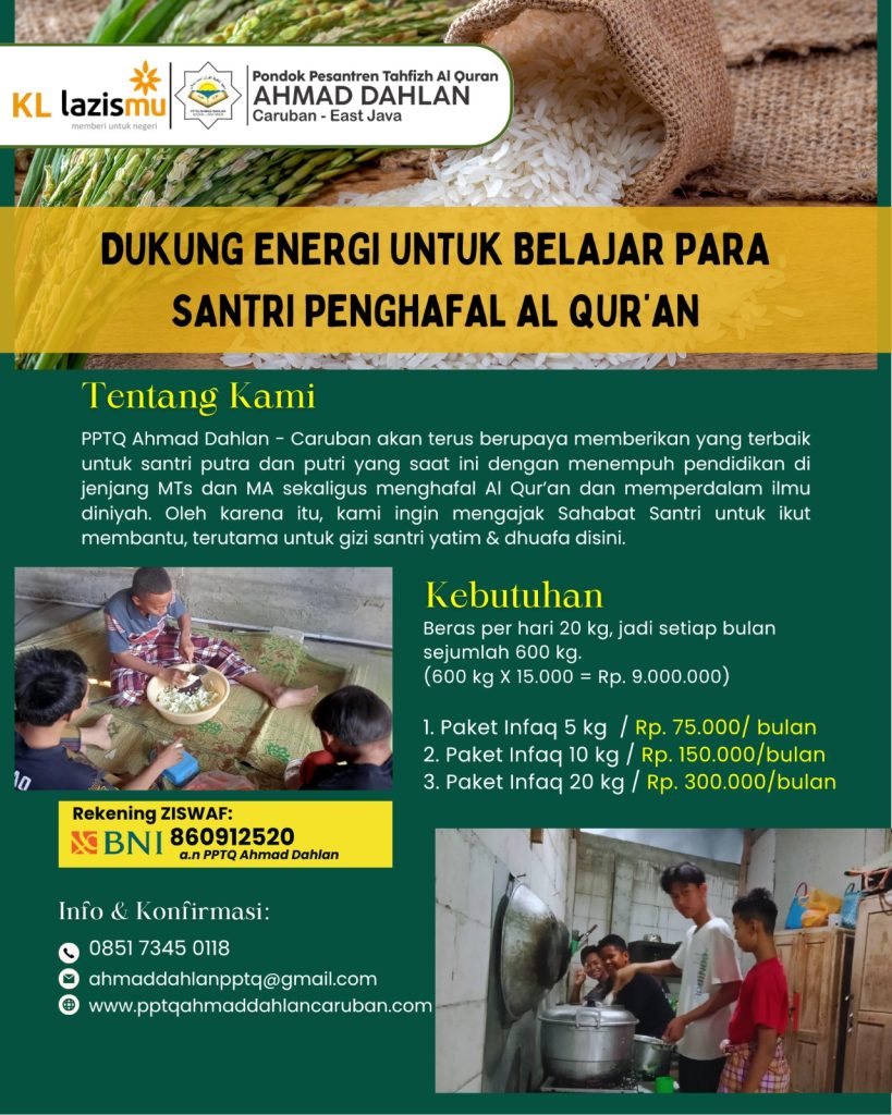 Sahabat Santri, yuk sedekah untuk berikan energi terbaik agar lebih dari 65 santri bisa belajar & menghafal Al Qur’an dengan baik. 😊 Infaq bisa berupa uang atau beras ya, Sahabat. 🌾💰Yang habis panen, bisa juga menunaikan Zakat Pertanian untuk para pejuang ilmu di PPTQ Ahmad Dahlan. 😇 Untuk informasi lebih lanjut dan konfirmasi, Sahabat bisa […]