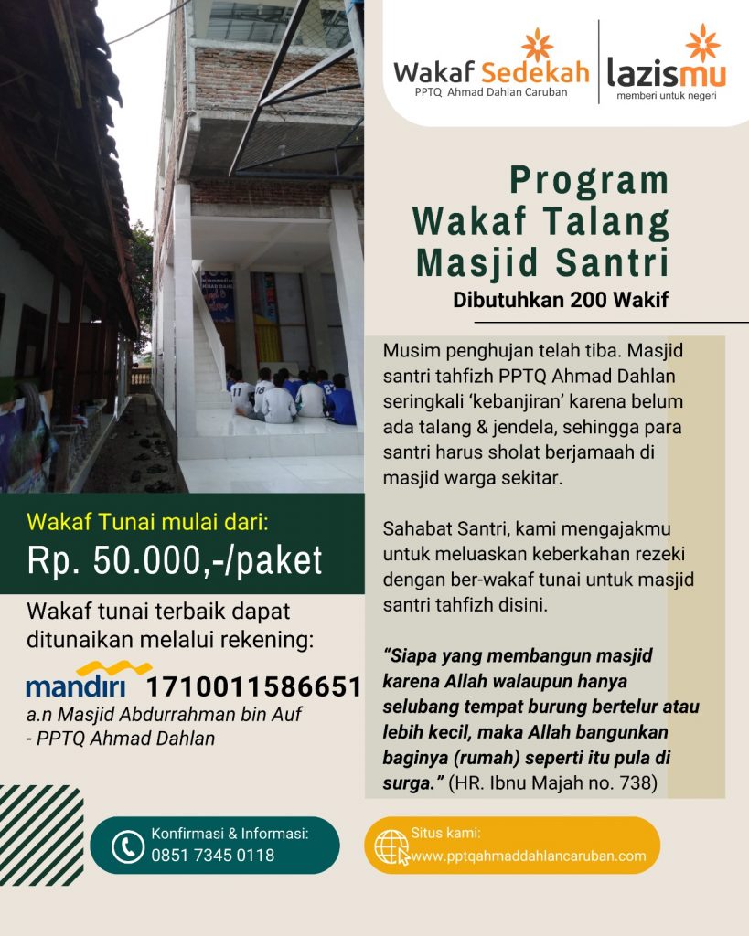 Dibutuhkan 200 Wakif untuk Talang Masjid Abdurrahman bin Auf-PPTQ Ahmad Dahlan ???? Musim penghujan tiba, namun masjid santri masih belum dilengkapi talang & jendela. Tak jarang mereka harus sholat berjamaah di masjid warga sekitar jika hujan deras. ???? Sahabat Santri, yuk sisihkan sebagian rezeki kita untuk menambah amal jariyah ????????Wakaf tunai mulai dari Rp.50.000/paket dapat […]