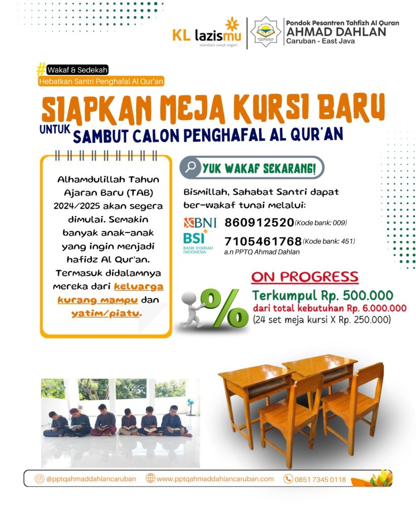 Terkumpul 8% sekitar Rp. 500.000 Wakaf Tunai, Mari Kita Upayakan Bersama Kebaikan ini ???? Alhamdulillah Sahabat, untuk saat ini terkumpul 8% dari total kebutuhan pengadaan meja & kursi wakaf santri. Masih ada kesempatan untuk kita meraih amal jariyah dengan berkontribusi dalam pendidikan anak-anak yatim dhuafa. ✨ Bismillah, semakin kuat tekad belanjakan rezeki untuk menambah keridhoanNya. […]