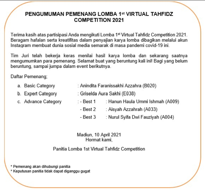 Tentunya pandemi tidak menyurutkan semangat kita dalam menghafal Al Qur’an. Ikhlaskan dan luruskan niat serta tujukan untuk mendapat ridho Allah. Mari kita jadikan ajang ini untuk menambah semangat putra putri kita dalam menghafal Al Qur’an di usia belia yang merupakan masa-masa emas bagi mereka untuk menghafal.