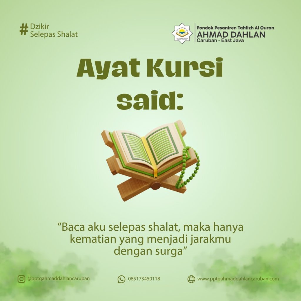 Artinya: “Barangsiapa membaca ayat kursi setiap selesai shalat maktubah (shalat fardhu) , maka tidak ada yang bisa menghalanginya untuk masuk surga kecuali kematian” (HR Imam Annasai)